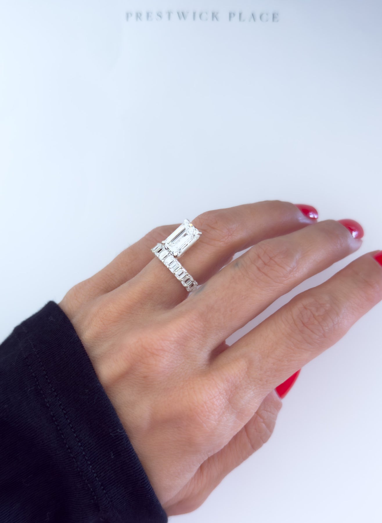 Featuring a single 3.0 carat Emerald Diamond carefully hand set atop a full emerald diamond band, this is one setting that won't go unnoticed.