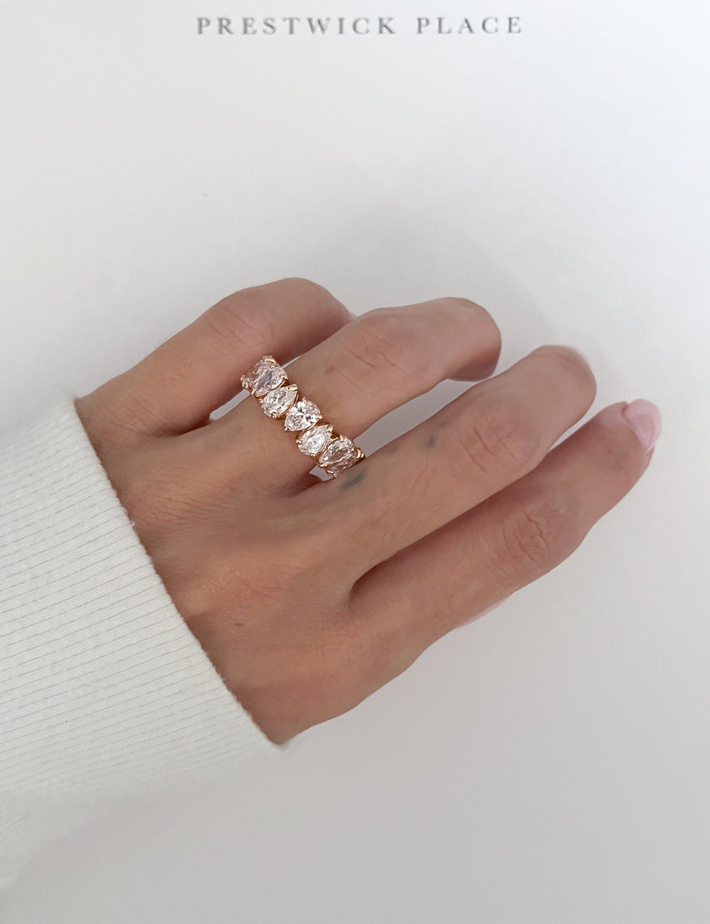 An eternity band is a timeless symbol of eternal love and devotion. Featuring a seamless circle of sparkling Pear cut lab diamonds, it represents infinity, unity, and the unending bond between two hearts.