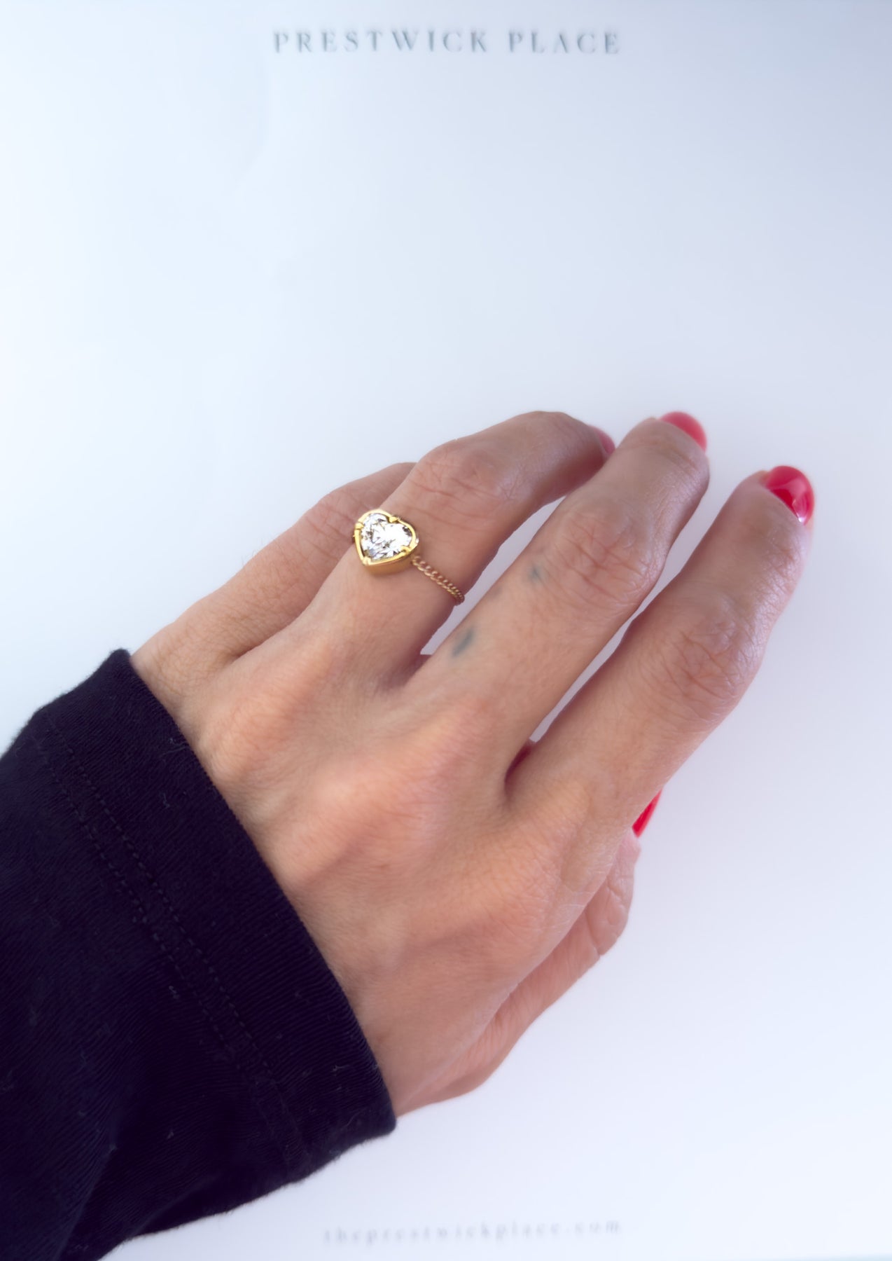 Delicate yet bold, The Heart Chain Ring features a 1.0ct lab-grown heart cut diamond, secured in a delicate compass claw bezel setting which features a chain band for ease and wearability.